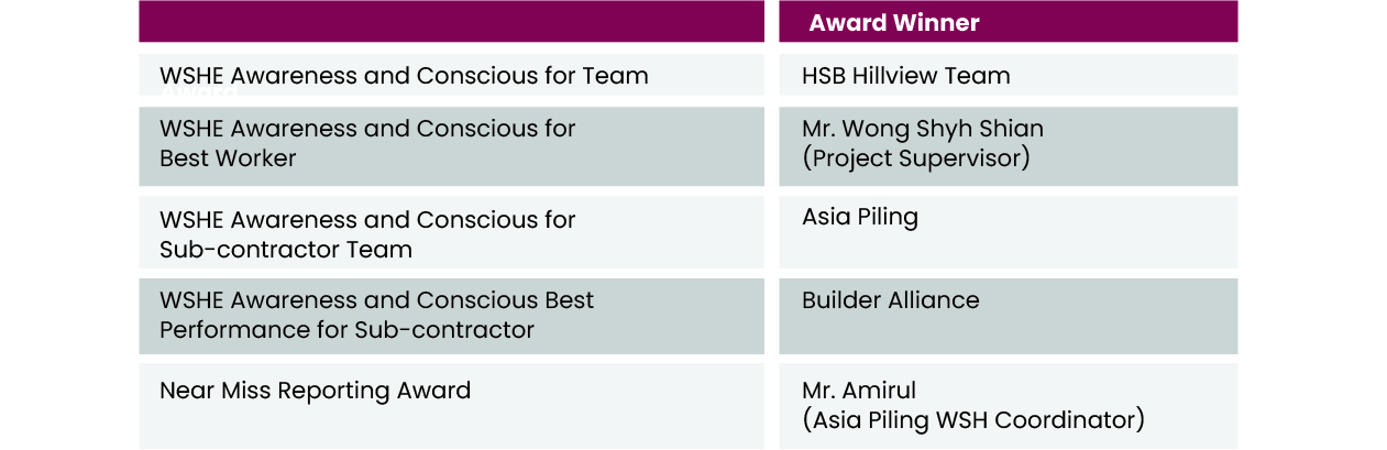 HSB launched our very first Innovation & Productivity Award to encourage inter-departments, projects sites and individual including workers to explore and come up with innovative, efficient methodology to enhance productivity. These include reviewing/ redesigning workflow and processes from planning, design, construction development to safety and streamlining routine tasks such as administrative aspects.