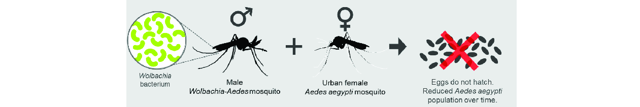 When the male Wolbachia-carrying Aedes mosquitoes mate with urban female Aedes mosquitoes that do not carry Wolbachia, their resulting eggs would not hatch. Over time, the continued release of the male Wolbachia-Aedes mosquitoes would lead to a decline in urban Aedes-mosquito population, hence reducing the risk of dengue and also other Aedes aegypti-borne diseases such as Zika and chikungunya. (source: worldmosquitoprogram.org)