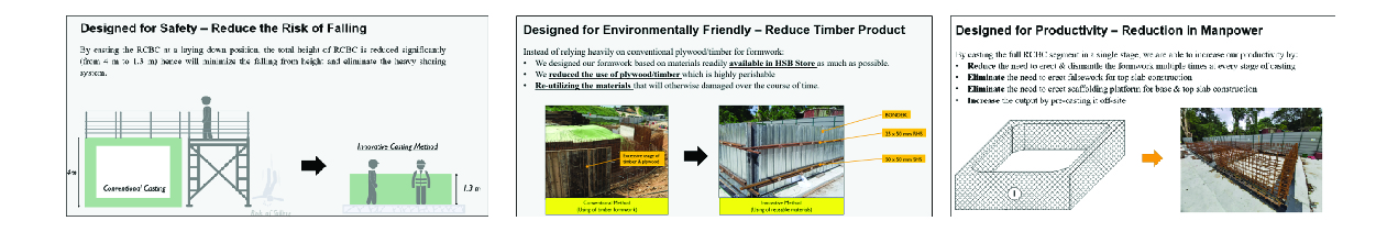 From on the adoption of precast RCBC on site, the team managed to achieve an overall 42% increase in productivity as compared to conventional cast-in situ method and this proposal was supported with safety factor considerations and PE design.
